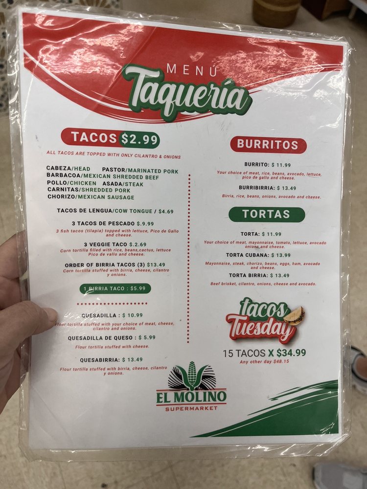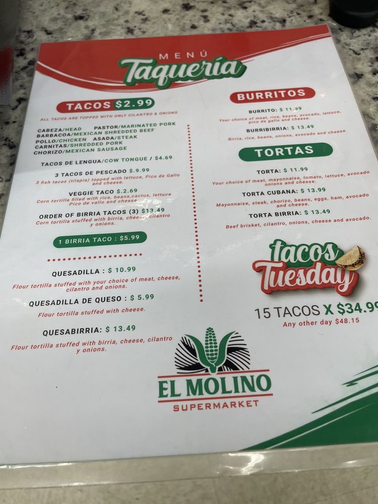 The supermarket shines with its diverse offerings, featuring fresh fruits, vegetables, and a refrigerated section brimming with guacamole and various salsas. Don't miss Taco Tuesday, where you can indulge in 15 mouthwatering tacos for just $35, a perfect way to sample the rich flavors of carnitas or el pastor. With friendly staff and a clean, inviting atmosphere, El Molino is truly a one-stop-shop for those craving genuine Mexican cuisine and more.